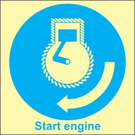 This IMO sign indicates the location of the engine start mechanism, used to activate the vessel's engine in case of an emergency.