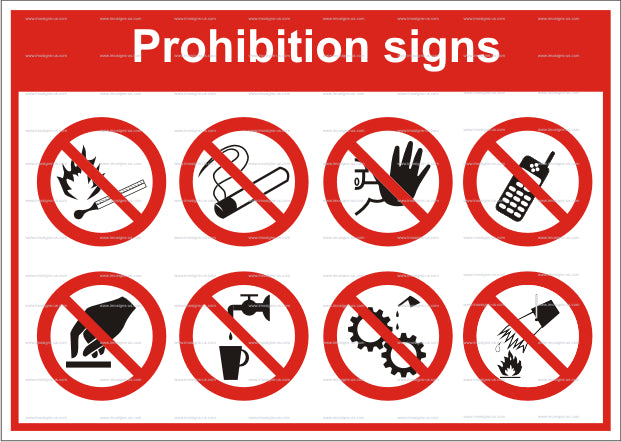 This poster displays a set of common prohibition symbols to help enforce workplace safety and prevent hazardous behavior.