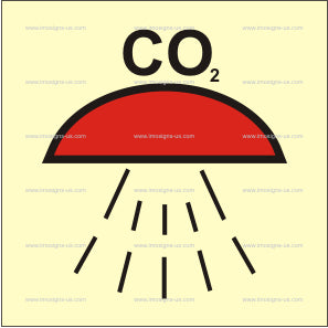 Complies with IMO Resolution A.952(23) — Graphical Symbols for Fire Control Plans, as required by SOLAS Chapter II-2. This IMO sign indicates that the space is protected by a fixed carbon dioxide (CO₂) fire-extinguishing system onboard ships.