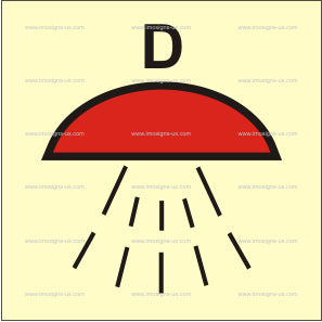 Complies with IMO Resolution A.952(23) — Graphical Symbols for Fire Control Plans, as required by SOLAS Chapter II-2. This IMO sign indicates that the marked space is protected by a drenching system, designed to suppress fire through water spray.