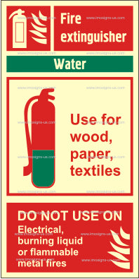 This IMO sign indicates the location of a water fire extinguisher, typically used for Class A fires involving solid combustibles like paper, wood, or textiles.