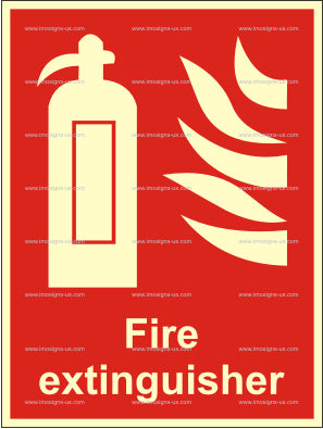 This IMO sign indicates the location of a fire extinguisher and includes clear text for enhanced recognition during emergencies. It is intended to assist crew and passengers in quickly identifying firefighting equipment.