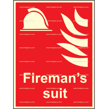 This IMO sign indicates the storage location of a fireman’s suit, which includes protective clothing and equipment used by trained personnel for onboard firefighting operations.