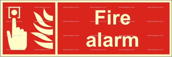 This IMO sign indicates the presence of a fire alarm and includes clear text for quick identification. It ensures crew and passengers can easily locate and activate the alarm system in the event of a fire.