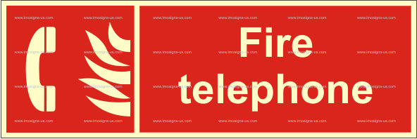 This IMO sign indicates the location of a fire telephone, featuring clear text and symbol to assist with rapid identification during emergencies. Fire telephones ensure direct communication between firefighting crew and control stations.