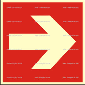 This IMO sign is a red directional arrow used on fire control plans to indicate the position and direction of fire-related equipment, systems, or movement routes (horizontal or vertical).