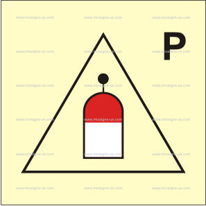 Complies with IMO Resolution A.952(23) — Graphical Symbols for Fire Control Plans, as required by SOLAS Chapter II-2.This IMO sign indicates the location of a remote release station for activating a fixed dry powder fire extinguishing system onboard.