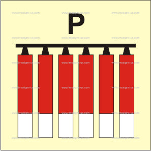 Complies with IMO Resolution A.952(23) — Graphical Symbols for Fire Control Plans, as required by SOLAS Chapter II-2.This IMO sign indicates the location of a fixed powder fire extinguishing battery, used as part of the vessel’s fire suppression system.