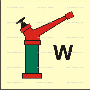 Complies with IMO Resolution A.952(23) — Graphical Symbols for Fire Control Plans, as required by SOLAS Chapter II-2.This IMO sign indicates the location of a water monitor (also known as a fire monitor or deluge gun), used to deliver large volumes of water to fight high-intensity fires on board.
