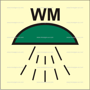 Complies with IMO Resolution A.952(23) — Graphical Symbols for Fire Control Plans, as required by SOLAS Chapter II-2. This IMO sign indicates spaces protected by a water mist fire suppression system onboard the vessel.