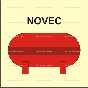 Complies with IMO Resolution A.952(23) and MSC/Circ.451/Rev.1 — Graphical Symbols for Fire Control Plans, as required by SOLAS Chapter II-2.This IMO sign indicates the installation of a fixed Novec™ 1230 fire extinguishing system onboard, used for rapid suppression of fire in protected areas.