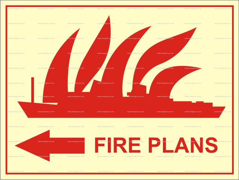 Complies with IMO Resolution A.952(23) — Graphical Symbols for Fire Control Plans, as required by SOLAS Chapter II-2, Regulation 15, and MSC/Circ.451 (including amendments MSC/Circ.451/Rev.1). This IMO sign indicates the location of onboard fire control plans, with an arrow pointing to the left. Fire plans provide detailed layouts of fire-fighting systems, emergency procedures, and equipment locations essential for onboard safety.