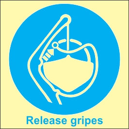 This IMO sign indicates the location of the release mechanism for the lifeboat gripes, which are used to secure the lifeboat to the davit system.